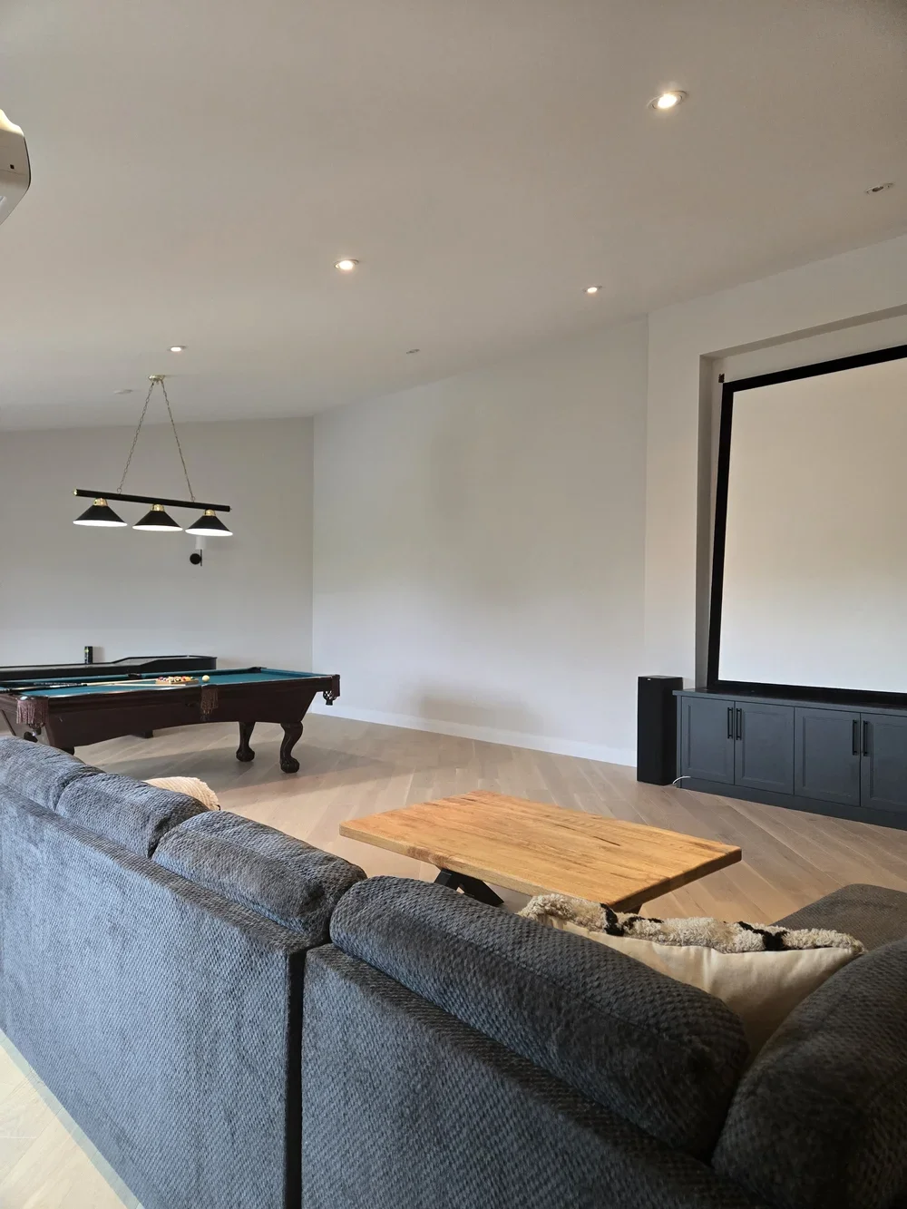 GAMES ROOM with pool table, shuffleboard table, fooseball table, projector screen